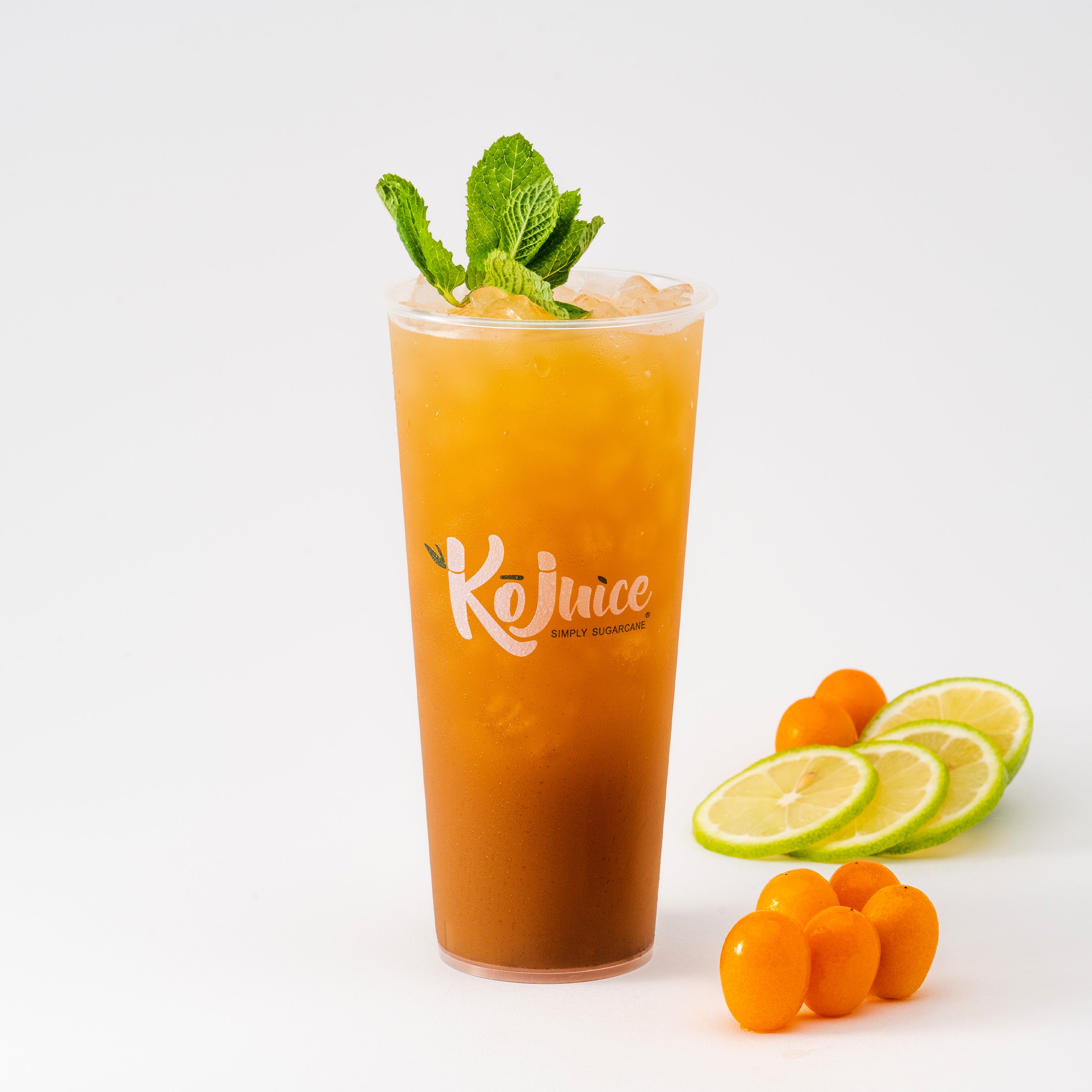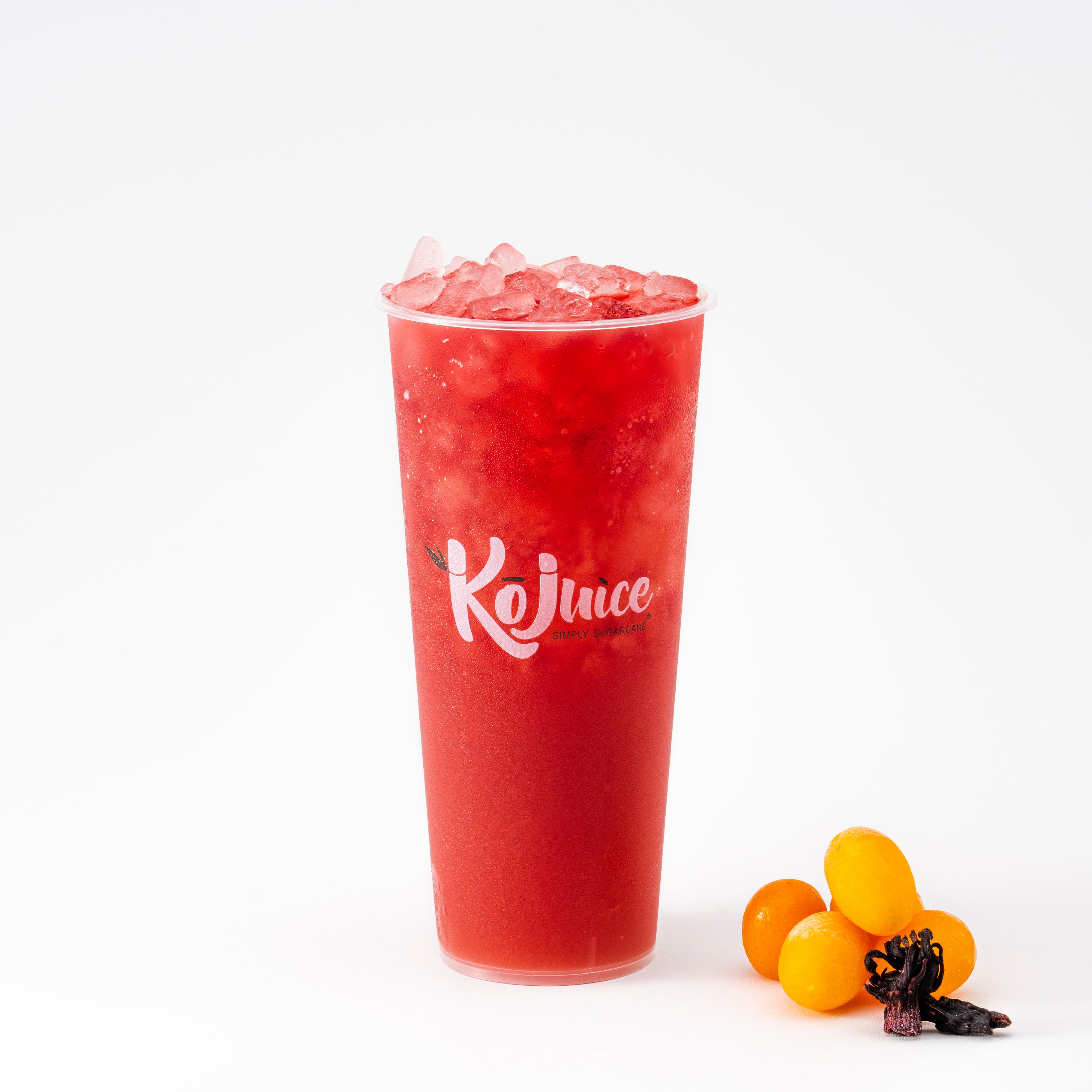 Fresh-pressed cane, cold-brewed hibiscus, kumquat, and mint leaves.