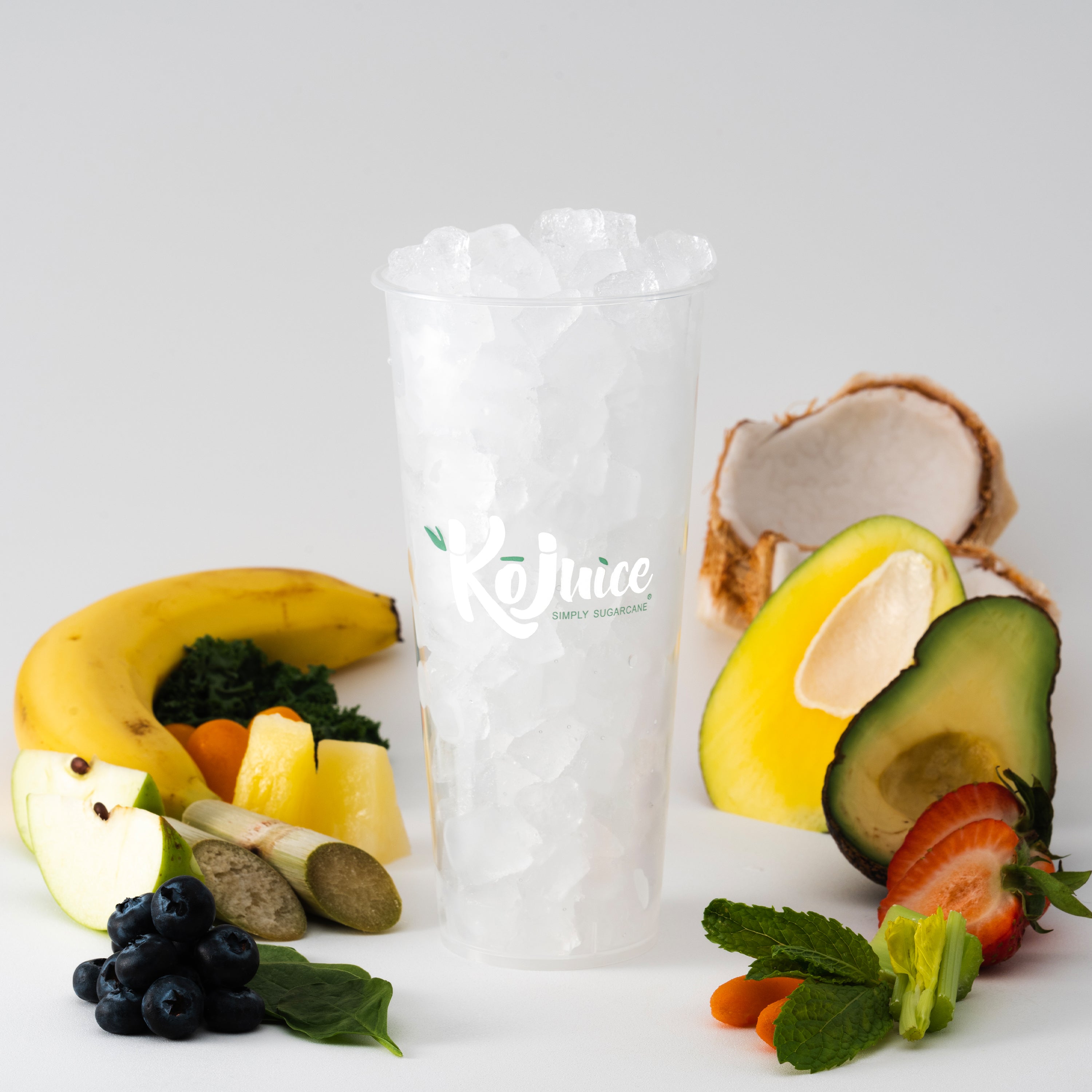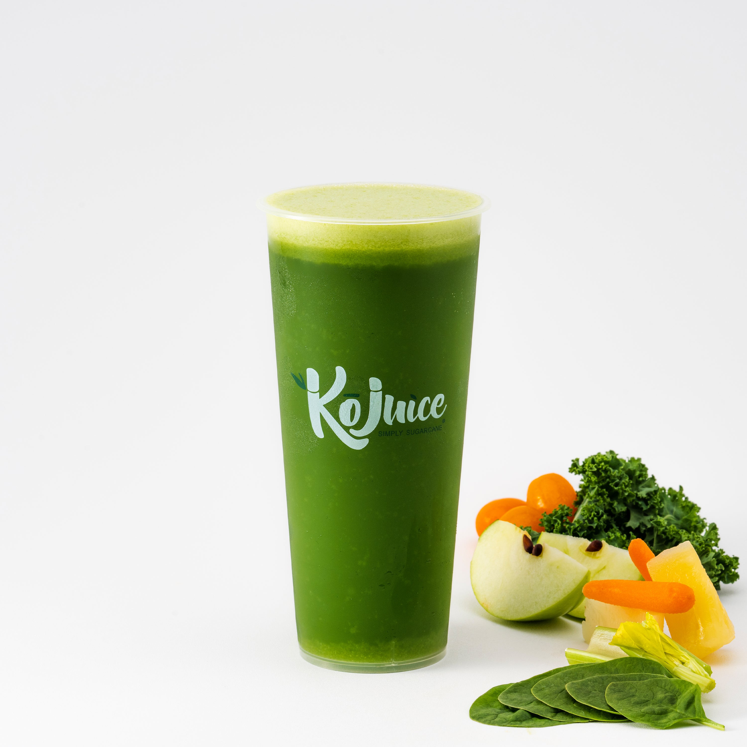 Fresh-pressed cane, fresh-blended ginger, kale, celery, spinach, carrot, kumquat, pineapple, and fresh-squeezed lime/lemon.