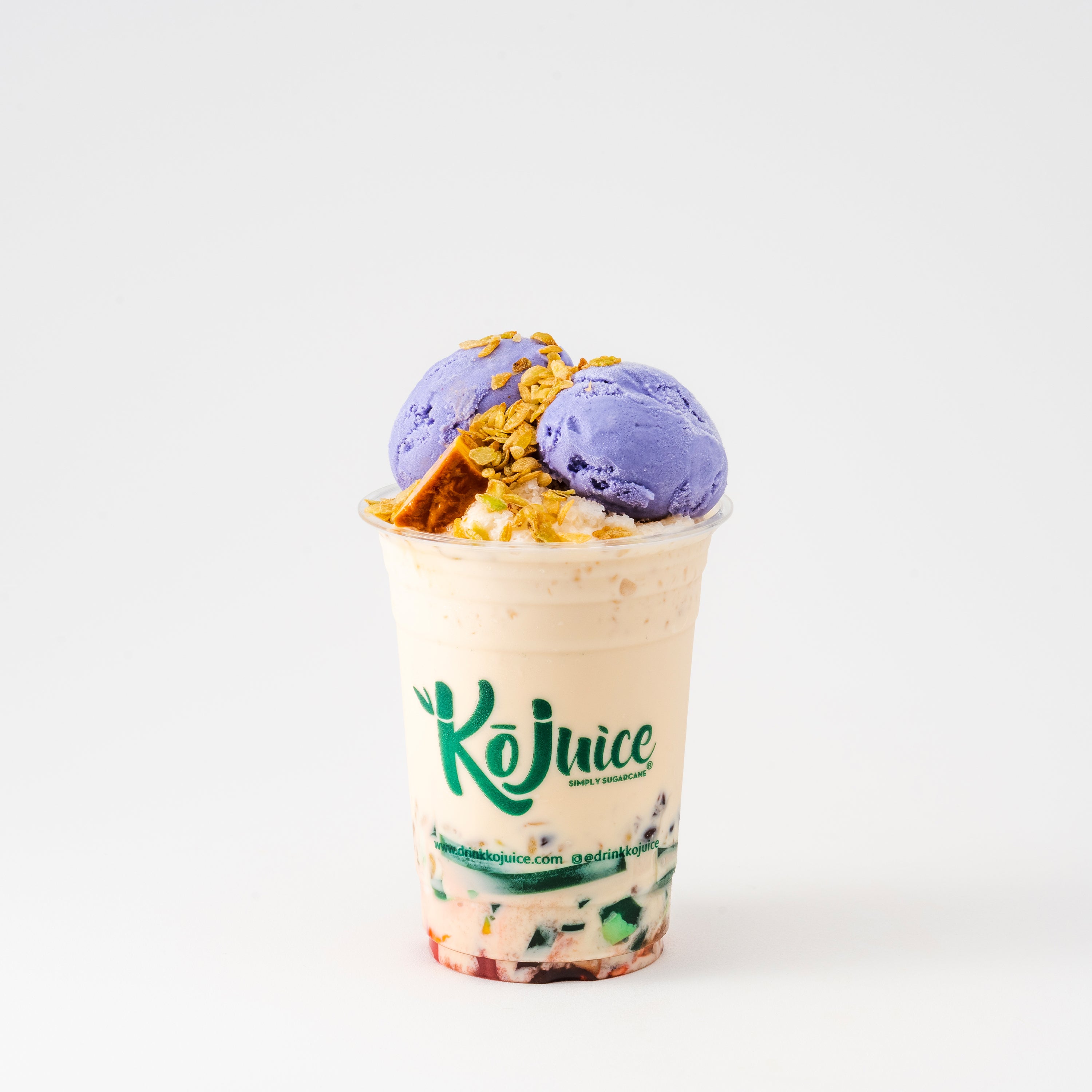 Nata de coco, jackfruit, coconut meat, ube jam, pandan green jelly, red beans, shaved ice, KoJuice special milk, rice crisp, ube ice cream, and flan.